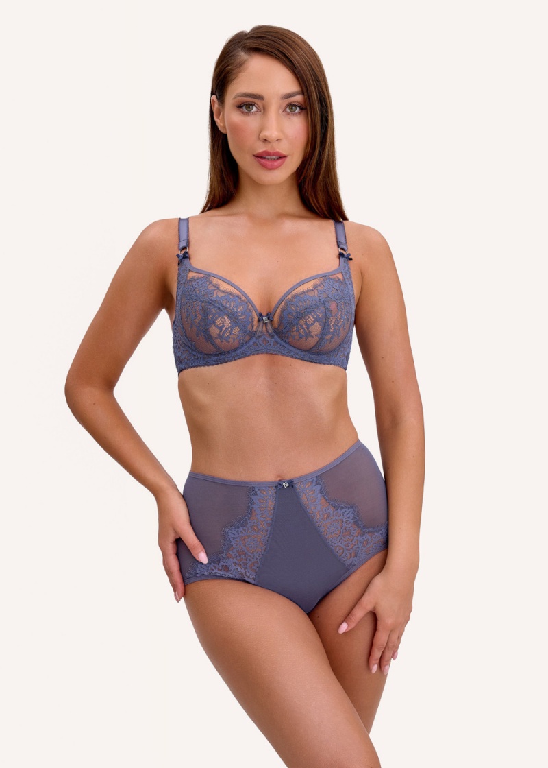 Biustonosz soft Kuszący Rubin S16 marki Bella Misteria w grafitowym odcieniu. Biustonosz ten skierowany jest dla kobiet ze średnim oraz dużym biustem, ceniących sobie komfort użytkowania oraz intrygującym, fantazyjnym wzornictwem. Model z jednym ukośnymi oraz dwoma poziomym cięciem, wzmocniony fiszbinami bardzo dobrze zbiera boki piersi, dzięki suportowi bocznemu. Delikatnie je podnosi, nadając im ładny, naturalny kształt. Miseczki uszyte z beżowego tiulu obszytego piękną, grafitową koronką z rzęskami w górnej części. Miski modelowane za pomocą drutów, które wraz ze wzrostem rozmiaru zwiększają swoją szerokość. Na łączeniach ramiączek z miskami mała, urocza kokardka. Mostek uszyty częściowo z koronki podszytej warstwą stabilnego tiulu. Po środku baskinki malutka kokardka oraz metaliczna zawieszka. Pas obwodu z podwójną ruchomą fiszbiną boczną, wykonany został ze gęstej, tiulowej siateczki, która zapewnia bardzo dobre podtrzymanie. Dużą zaleta biustonosza są poszerzone ramiączka, które zapewniają komfort w noszeniu, nie odpinane o różnych szerokościach w zależności od rozmiaru. Metaliczne dodatki dodają elegancji, nie zawierają niklu. Biustonosz zapinany na haftki 3-stopniowe, dwu lub trzyrzędowa w zależności od rozmiaru. Biustonosz uszyty w Polsce.