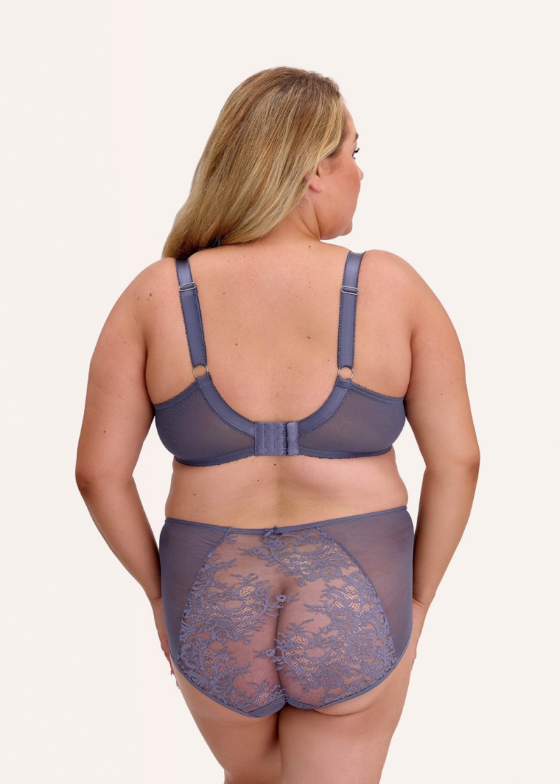 Biustonosz soft Grafitowy Irys S16MX marki Bella Misteria w grafitowym odcieniu. Biustonosz ten skierowany jest dla kobiet z dużym oraz bardzo dużym biustem, ceniących sobie komfort użytkowania oraz intrygującym, fantazyjnym wzornictwem. Model z jednym ukośnymi oraz dwoma poziomym cięciem, wzmocniony fiszbinami bardzo dobrze zbiera boki piersi, dzięki suportowi bocznemu. Potrójne cięcie miski sprawi że biust będzie wyjątkowo zaokrąglony, podniesiony i zebrany do środka. Miseczki uszyte z beżowego tiulu obszytego piękną, grafitową koronką z rzęskami w górnej części. Dolna miska wzmocniona delikatnym tiulem podnosi i formuje biust. Dzięki elastycznej siateczce na górnej misce, miseczki z łatwością dopasowują się do biustu. Boczna część miski przechodząca w ramiączko doskonale zbiera biust do środka. Miski modelowane za pomocą drutów, które wraz ze wzrostem rozmiaru zwiększają swoją szerokość. Na łączeniach ramiączek z miskami mała, urocza kokardka. Mostek uszyty częściowo z koronki podszytej warstwą stabilnego tiulu. Po środku baskinki malutka kokardka oraz metaliczna zawieszka. Pas obwodu bez fiszbin pionowych, wykonany został ze stabilnego, tiulowej siateczki, która zapewnia bardzo dobre podtrzymanie. Dużą zaleta biustonosza są poszerzone ramiączka, które zapewniają komfort w noszeniu, nie odpinane o różnych szerokościach w zależności od rozmiaru. Metaliczne dodatki dodają elegancji, nie zawierają niklu. Biustonosz zapinany na haftki 3-stopniowe, dwu lub trzyrzędowa w zależności od rozmiaru. Biustonosz uszyty w Polsce.