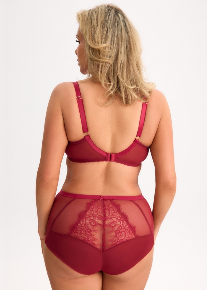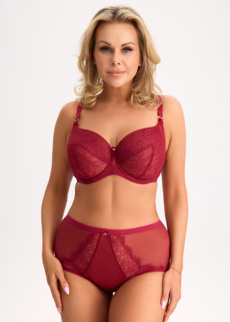 Biustonosz soft Kuszący Rubin S16MX marki Bella Misteria w bordowym odcieniu. Biustonosz ten skierowany jest dla kobiet z dużym oraz bardzo dużym biustem, ceniących sobie komfort użytkowania oraz intrygującym, fantazyjnym wzornictwem. Model z jednym ukośnymi oraz dwoma poziomym cięciem, wzmocniony fiszbinami bardzo dobrze zbiera boki piersi, dzięki suportowi bocznemu. Potrójne cięcie miski sprawi że biust będzie wyjątkowo zaokrąglony, podniesiony i zebrany do środka. Miseczki uszyte z podwójnego tiulu obszytego piękną koronki z rzęskami w górnej części. Dolna miska wzmocniona delikatnym tiulem podnosi i formuje biust. Dzięki elastycznej siateczce na górnej misce, miseczki z łatwością dopasowują się do biustu. Boczna część miski przechodząca w ramiączko doskonale zbiera biust do środka. Miski modelowane za pomocą drutów, które wraz ze wzrostem rozmiaru zwiększają swoją szerokość. Na łączeniach ramiączek z miskami mała, urocza kokardka. Mostek uszyty częściowo z koronki podszytej warstwą stabilnego tiulu. Po środku baskinki malutka kokardka oraz złota zawieszka. Pas obwodu bez fiszbin pionowych, wykonany został ze stabilnego, tiulowej siateczki, która zapewnia bardzo dobre podtrzymanie. Dużą zaleta biustonosza są poszerzone ramiączka, które zapewniają komfort w noszeniu, nie odpinane o różnych szerokościach w zależności od rozmiaru. Złote dodatki dodają elegancji, nie zawierają niklu. Biustonosz zapinany na haftki 3-stopniowe, dwu lub trzyrzędowa w zależności od rozmiaru. Biustonosz uszyty w Polsce.