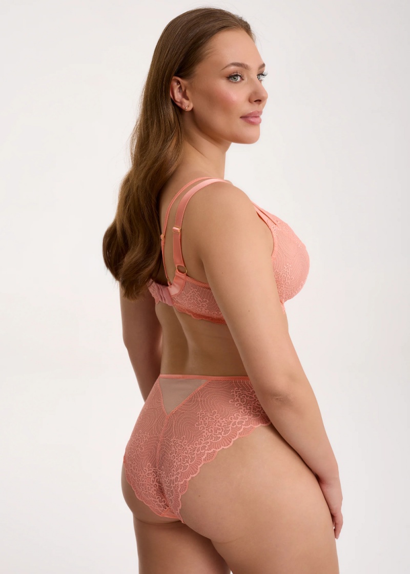 Biustonosz soft Maribel marki Ewa Bień w odcieniu brzoskwiniowym. Model w konstrukcji B161 to miękki biustonosz z fiszbinami, dedykowany jest dla kobiet ze średnim oraz dużym biustem, ceniących sobie komfort użytkowania. To bestselerowy fason staniczka. Miseczki z jednym ukośnymi oraz jednym poziomym cięciem. Posiada zabudowane miseczki i wysoki mostek, co skutecznie zasłania większą część piersi. Dzięki temu modelowi, biust jest znacząco uniesiony i skierowany do środka, kształtując piersi w kule. Miseczki wykonane są tiulu obszytego koronką w geometryczny wzorze. Górna część miseczki została połączona o dodatkowym ozdobnym ramiączkiem, idealnie opina zarys piersi. Model to przepiękne połączenie najwyższej jakości, szwajcarskiego haftu oraz delikatnego, beżowego tiulu. Delikatny haft dodaje lekkości, a całość tworzy wysmakowaną kompozycję dla kobiet, które cenią nowoczesną elegancję w najbardziej zmysłowym wydaniu. Wysoki mostek uszyty z warstwy stabilnego tiulu oraz haftu, ozdobionego nowoczesną kokardą z ozdobą biżuteryjną. Pas obwodu bez fiszbiny bocznej, wykonany został ze stabilnego, elastycznego, prześwitującego tiulu, która zapewnia bardzo dobre podtrzymanie. Dużą zaleta biustonosza są szersze ramiączka, które zapewniają komfort w noszeniu, nieodpinane o różnych szerokościach w zależności od rozmiaru. Niesamowicie delikatna tkanina zapewniają komfort i jest przyjemne w dotyku. Złote ozdoby i dodatki nie zawierają niklu. Brzoskwiniowy odcień otula ciało jak luksusowa tkanina, podkreślając naturalne piękno skóry. Biustonosz zapinany na haftki 3-stopniowe, dwu lub trzyrzędowa w zależności od rozmiaru. Biustonosz zaprojektowany i wyprodukowany w Polsce.