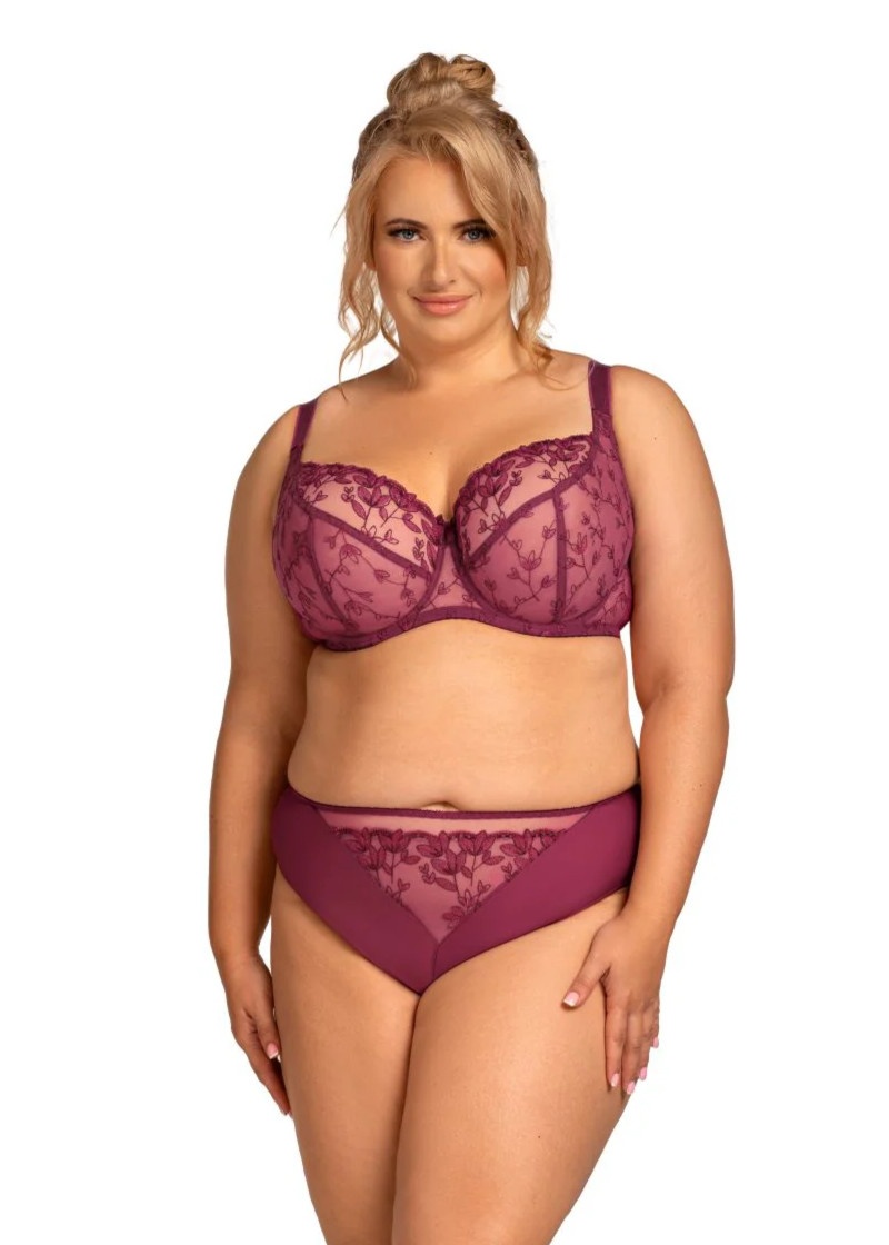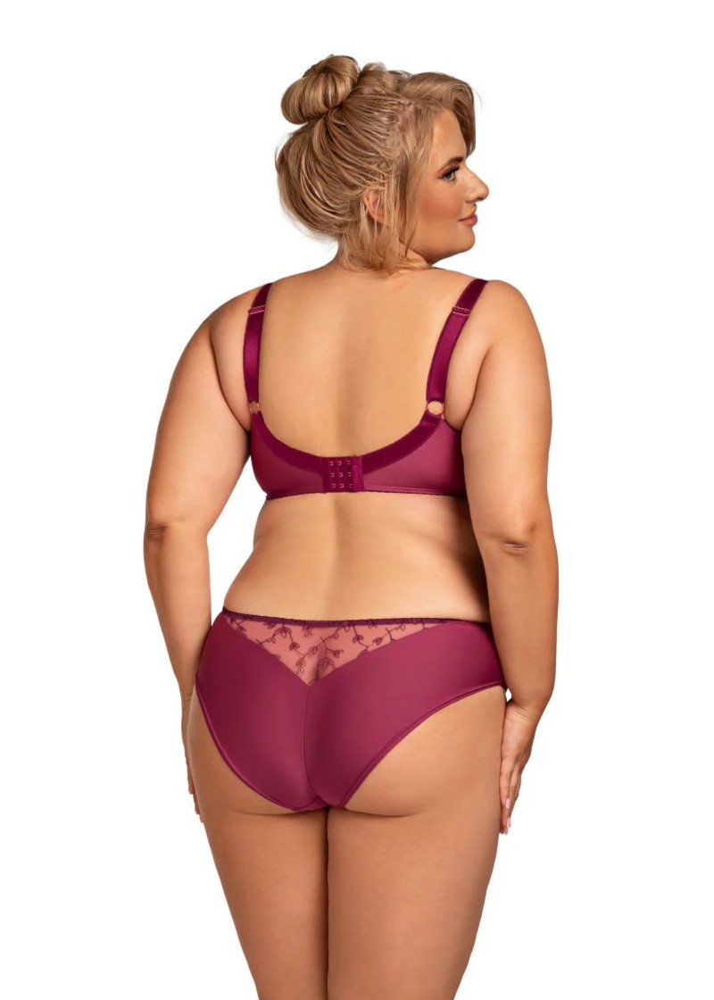 Biustonosz soft Nel producenta bielizny Nessa w burgundowym odcieniu z połyskującym haftem. Model polecany szczególnie Paniom ze średnim oraz dużym biustem. Konstrukcja biustonosza N500 bardzo dobrze zbiera boczki piersi i nadaje piersiom ładny naturalny kształt. Miękkie miseczki na fiszbinach, o jednym pionowym oraz poziomym cięciu. Wykonane z tiulowej siateczki, ozdobionej fantazyjnym roślinnym wzorem, kontrastującym odcieniu. Górny brzeg obszyty od wewnętrznej strony elastyczną lamówką, ładnie opina zarys piersi. To propozycja dla kobiet, które pragną połączyć wygodę codziennego noszenia z eleganckim wyglądem. Miękkie miseczki ozdobione subtelnym haftem pięknie podkreślają biust, zapewniając jednocześnie doskonałe podtrzymanie. Konstrukcja świetnie radzi sobie nawet przy bardzo dużym biuście, unosząc go ku górze. Mostkiem ozdobiony delikatną kokardką w beżowym kolorze oraz ozdobą biżuteryjną. Obwód stabilny bez fiszbiny bocznej, wykonany z dzianiny o gęstej gramaturze. Ozdobne, szerokie ramiączka, dostosowane do wielkości miseczki, regulowane na całej długości, nieodpinane. Biustonosza zapinany z tyłu na 3-rzędową, 3-stopniową haftkę. Biustonosz wykonany w Polsce.
