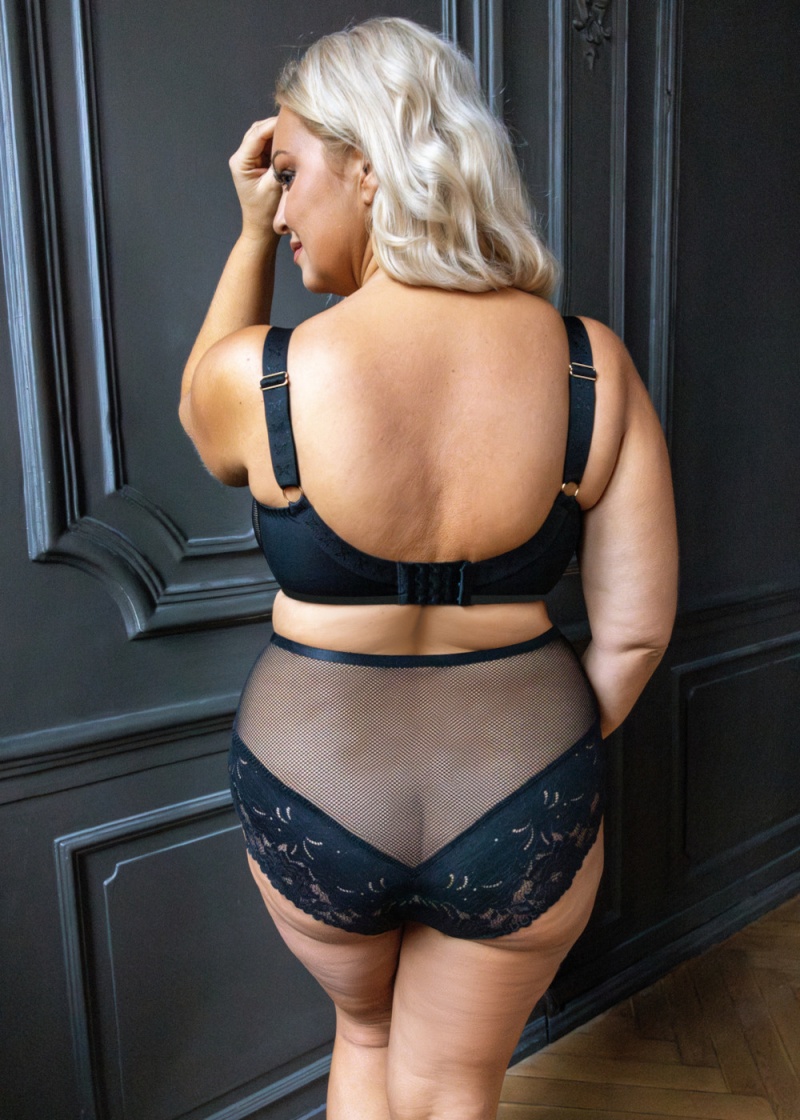 Biustonosz soft Cotton Flower polskiego producenta bielizny damskiej Kris Line w czarnym kolorze. Model w konstrukcji Soft Full Cup L0150 BL, przeznaczony dla luźnych, dużych oraz bardzo dużych biustów. Wyróżnia się pełnymi, zabudowanymi miseczkami, które obejmują całe piersi. Dzięki bocznemu panelowi (side support) zbiera biust z boków, maskując niedoskonałości w rejonie pachy. Produkt zapewnia stuprocentowe poczucie komfortu oraz skutecznie podtrzymuje biust niezależnie od jego wielkości. Dolna część miseczki dzielona na trzy części. Miękkie miseczki biustonosza oparte na fiszbinach, wykonane z stabilnej, beżowej siateczki, pokrytej pięknym, czarnym, geometrycznym wzorem oraz haftowaną koronką. Górna część miseczek podszyta od wewnętrznej strony elastyczną lamówką, co nadaje piersiom kuszący wygląd. Wysoki mostek wykonany z beżowej siateczki, ozdobiony złotym logo firmy. Ozdobne, szerokie ramiączka, regulowane na całej długości, nieodpinane. Szerokość ich dostosowana do wielkości miseczki. Obwód biustonosza uszyty z gładkiej dzianiny, z fiszbiną boczną, która zapobiega rolowaniu się materiału. Model ozdobiony złotymi dodatkami, nadającymi całości luksusowego charakter. Staniczek zapewnia 100% poczucie komfortu, zapewnia dobre podtrzymanie ciężkich piersi, jednocześnie dbając o zalety estetyczne. Biustonosz zapinany z tyłu na 3-rzędowe, 3-4 stopniowe haftki.