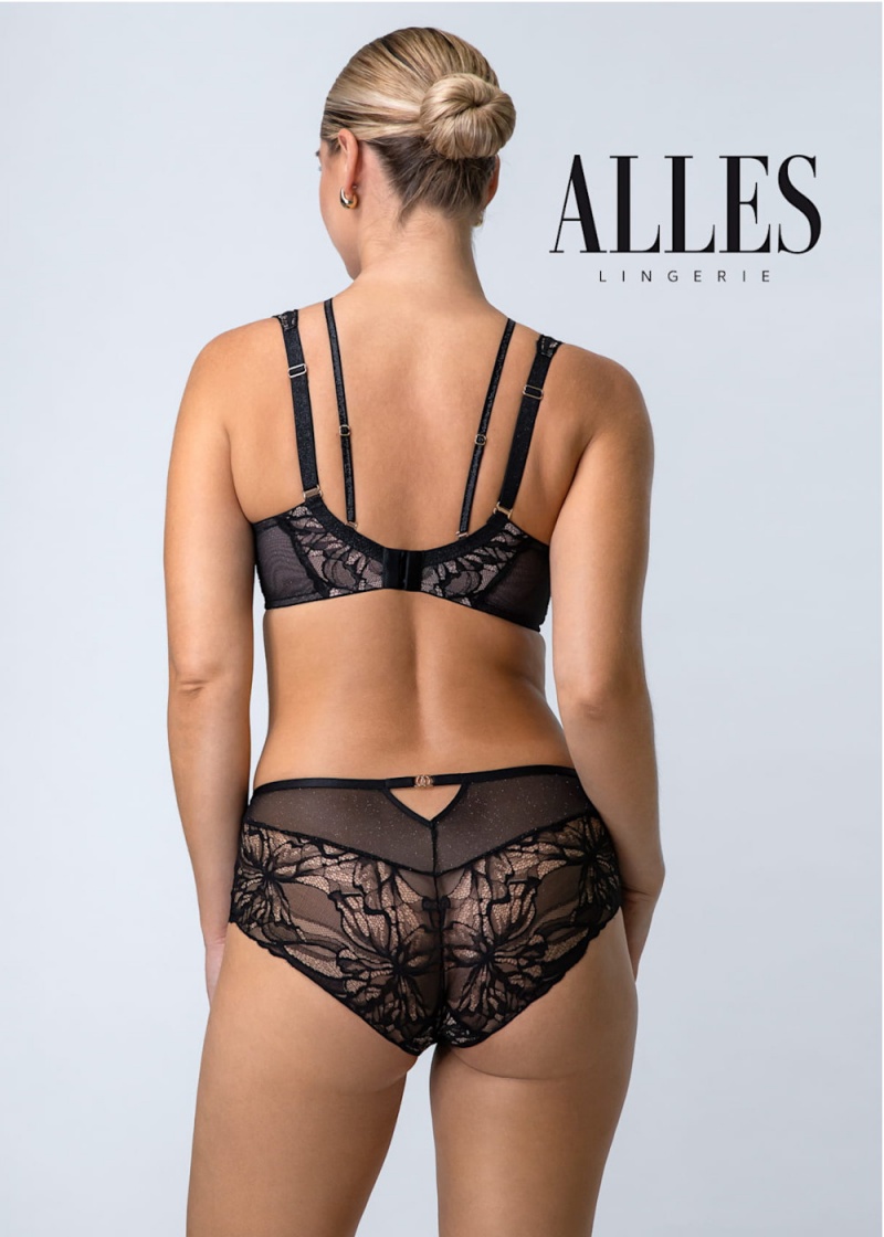 Figi damskie The Icon marki Alles typ klasyczny, zabudowany z wysokim stanem w czarnym kolorze. Model harmonijnie łączy kobiecą subtelność z praktycznym komfortem. Wysoki pas podkreśla talię i delikatnie modeluje sylwetkę, zapewniając wygodę przez cały dzień. Pełniejsze krycie pośladków daje poczucie swobody i lekkości, dzięki czemu figi sprawdzą się zarówno w codziennym użytkowaniu, jak i jako zmysłowy dodatek pod eleganckim strojem. To idealny balans między stylem, komfortem i nowoczesnym designem. Figi z wysokim stanem celebrują kobiecą magnetyczną aurę. Połączenie czarnej kwiatowej koronki, brokatowych tiuli i złotych akcentów nadaje skórze elegancki, subtelnie mieniący się efekt. Tył ze szwem po środku, zakończony bezszwowo koronką. W górnej części trójkątne wycięcie. Figi przylegają do ciała, nie przecinając pośladków. W pasie wąska guma. Całość dopełniają biżuteryjne detale w odcieniu jasnego złota, dodając modelowi luksusowego charakteru. Zmysłowy krój i delikatne przezroczystości nadają im wyjątkowo kobiecego charakteru. Zapewnią Ci komfort i podkreślenie Twoich pięknych krągłości w subtelny sposób. Dla lepszego komfortu kroczek podszyty bawełną.