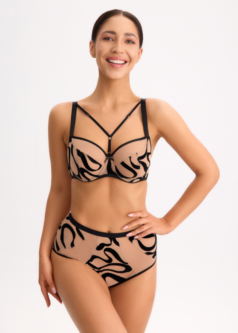 Figi damskie Czarny Agat FP2 marki Bella Misteria typ klasyczne o wyższym stanie w beżowo-czarnym odcieniu. Figi wykonane w całości z tiulowej gęstej siateczki, która częściowo została ozdobiona geometrycznym wzorem. Model zakrywają całe pośladki, są nieco bardziej zabudowane. Wykończone z tyłu bezszwowo. W pasie szersza gumka. Figi doskonale podkreślają uda i sprawią, że pośladki są jeszcze bardziej ponętne. Kroczek od wewnętrznej strony wyłożony jest bawełną dla zwiększenia komfortu użytkowania.