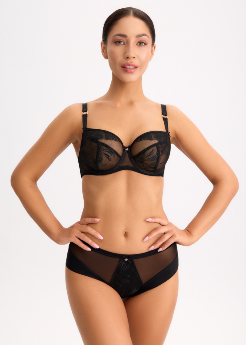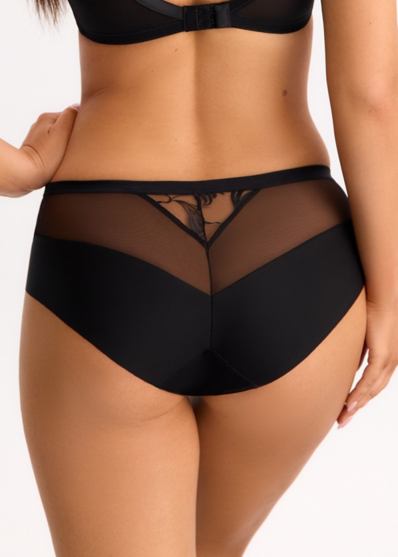 Figi damskie Czarny Diament FP1 marki Bella Misteria typ Klasyczny o średnim stanie w czarnym kolorze. Model o kroju zabudowanym o delikatnej formie. Figi wykonane w całości z delikatnej dzianiny, tiulowej siateczki oraz haftu. Przód ozdobiony wstawkami tiulu oraz haftowanego plenu. Tył ze szew pośrodku, ślicznie eksponuje pośladki. W górnej części trójkątne wycięcie z haftek. Tył wykończony bezszwowo, zastosowano technologie clean cut. Figi zakrywają całe pośladki. W pasie szersza gumka, szczyt ozdobiony kokardką oraz ozdobą biżuteryjną. Figi doskonale podkreślają uda i sprawią, że pośladki są jeszcze bardziej ponętne. Kuszące przezroczystości oraz delikatność koronki podkreślą Twoją kobiecość. Pozwalając Ci poczuć się w nich zmysłowo, ponętnie i uwodzicielsko, nie odsłaniając przy tym zbyt wiele. Kroczek od wewnętrznej strony wyłożony jest bawełną dla zwiększenia komfortu użytkowania.