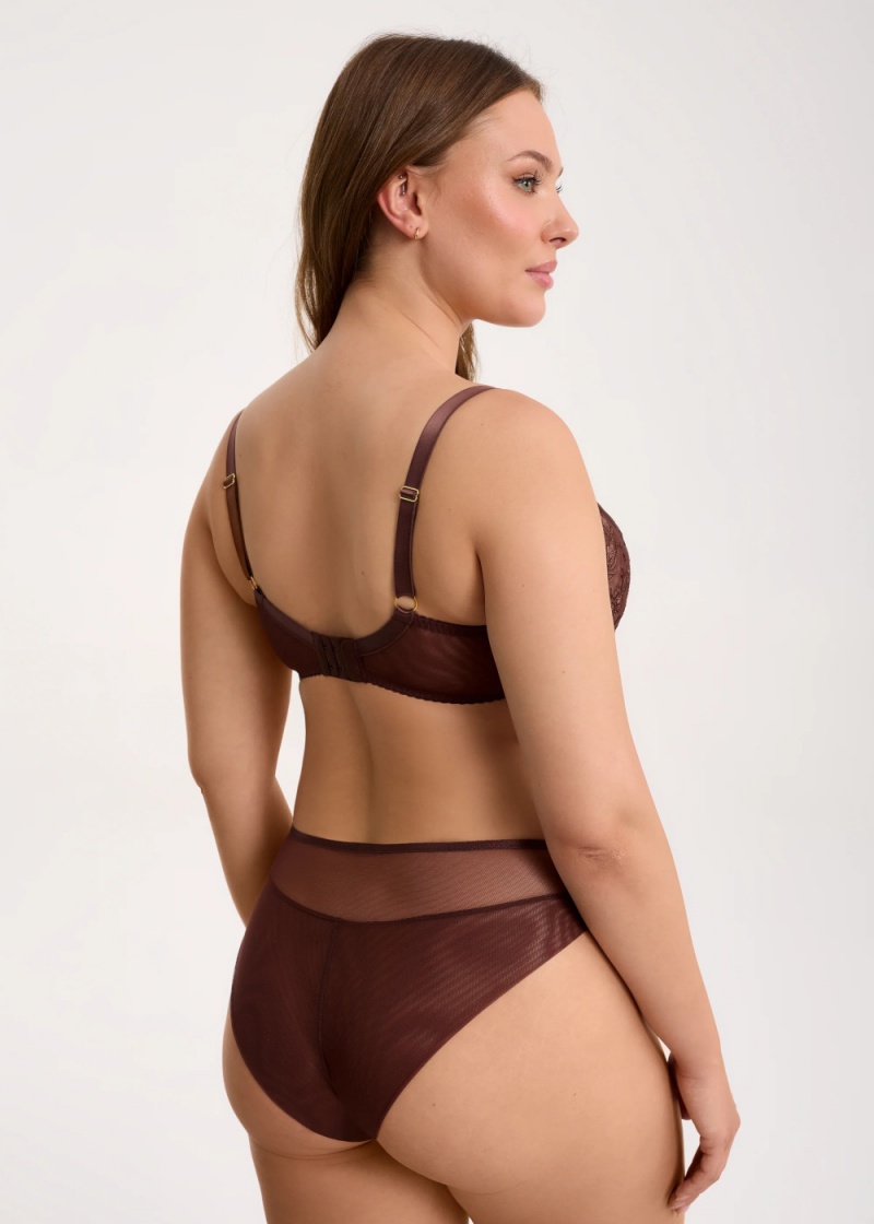 Figi damskie Kira C110 polskiego producenta bielizny damskiej Ewa Bień w czekoladowym odcieniu. Model C110 to najbardziej klasyczny i uniwersalny fason majtek. Majtki figi charakteryzują się umiarkowanym stanem, sięgającym okolic kości biodrowych i zakrywają 3/4 powierzchni pośladków. Przód majtek wykonany został z haftu w delikatny roślinny wzór oraz lekko prześwitującej siatki. Tył majtek uszyty został ze złożonego prześwitującego tiulu, dzięki czemu majtki nie powinny odznaczać się pod ubraniem ani przecinać pośladków. Kroczek podszyty od środka bawełną dla zwiększenia komfortu użytkowania. Figi zostały zaprojektowane i wyprodukowane w Polsce.