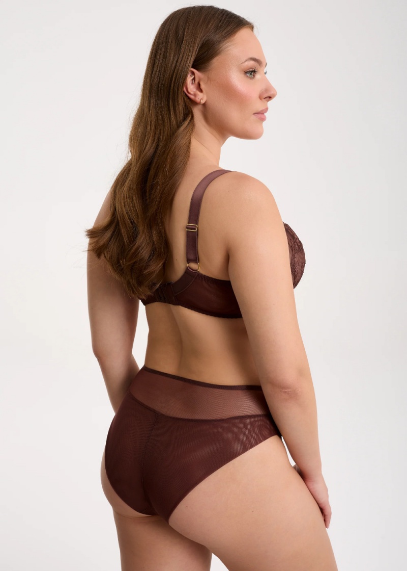 Figi damskie Kira C125 polskiego producenta bielizny damskiej Ewa Bień typ wysokie w odcieniu czekoladowym. Model C125 to klasyczne figi z wysokim stanem - sięgają okolic pępka i zakrywają 3/4 powierzchni pośladków. Przód majtek wykonany został z haftu w delikatny roślinny wzór oraz lekko prześwitującej siatki. Tył majtek uszyty został ze złożonego prześwitującego tiulu, dzięki czemu majtki nie powinny odznaczać się pod ubraniem ani przecinać pośladków. Dodatkowa ozdoba w postaci kokardki na przodzie majtek. Kroczek podszyty od środka bawełną dla zwiększenia komfortu użytkowania. Figi zostały zaprojektowane i wyprodukowane w Polsce.
