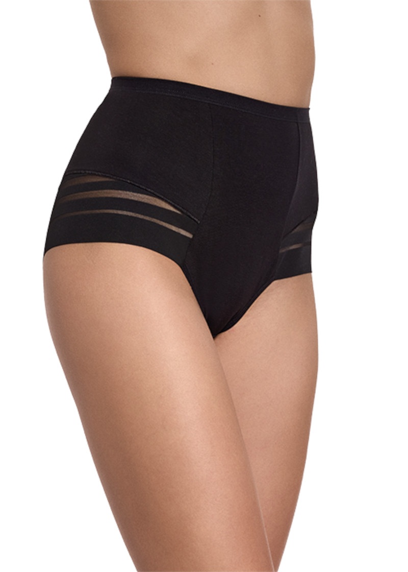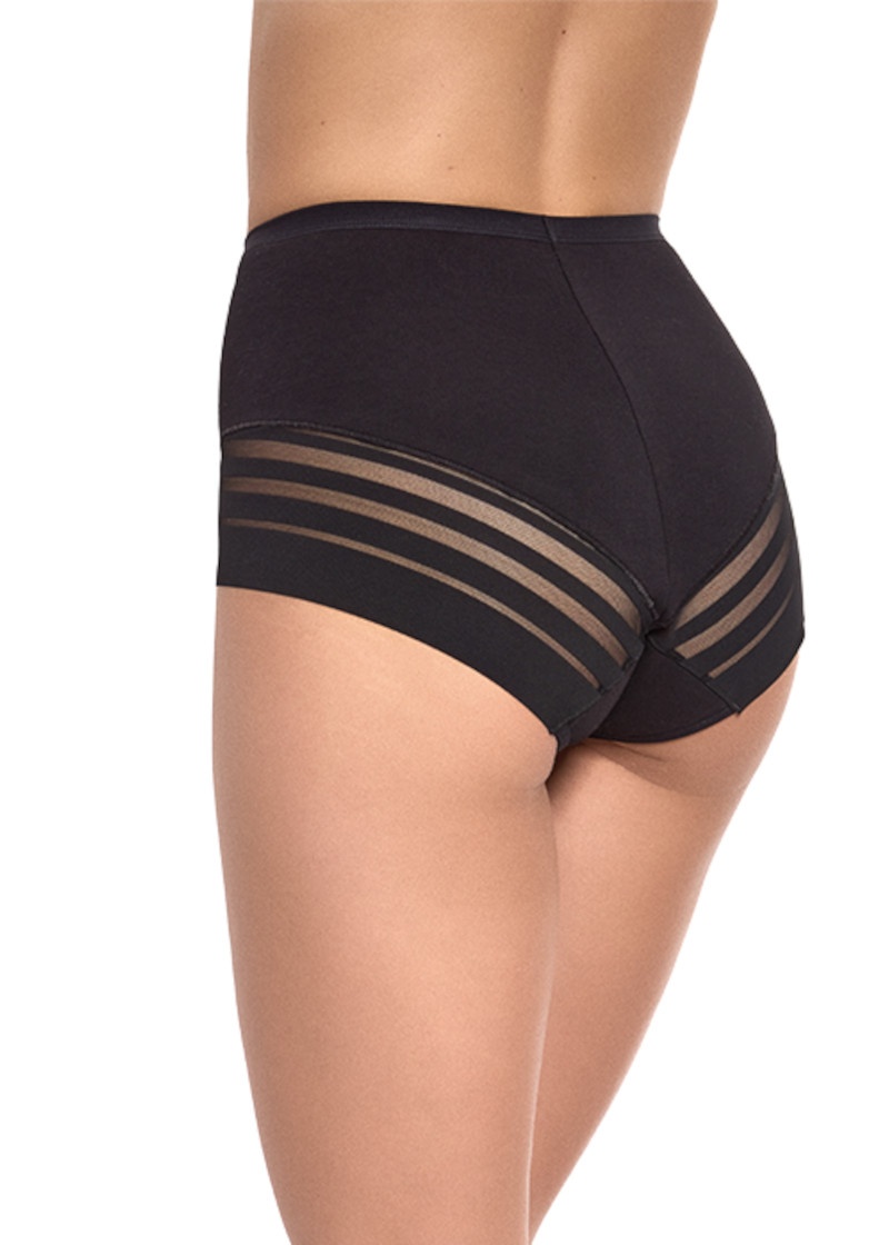 Figi damskie Nr 209 marki Gabidar typ o podwyższonym kroju w czarnym kolorze. Model o pełnym kroju, uszyty z bawełny z domieszką elastanu. Figi idealne dla każdej kobiecej sylwetki. W pasie szeroka gumka. Przód oraz tył ozdobiony w dolnej części delikatną dzianiną w transparentne paski. Transparentne paski podkreśla kształt pośladków. W kroczku wkładka ze 100% bawełny, podnosi komfort noszenia.