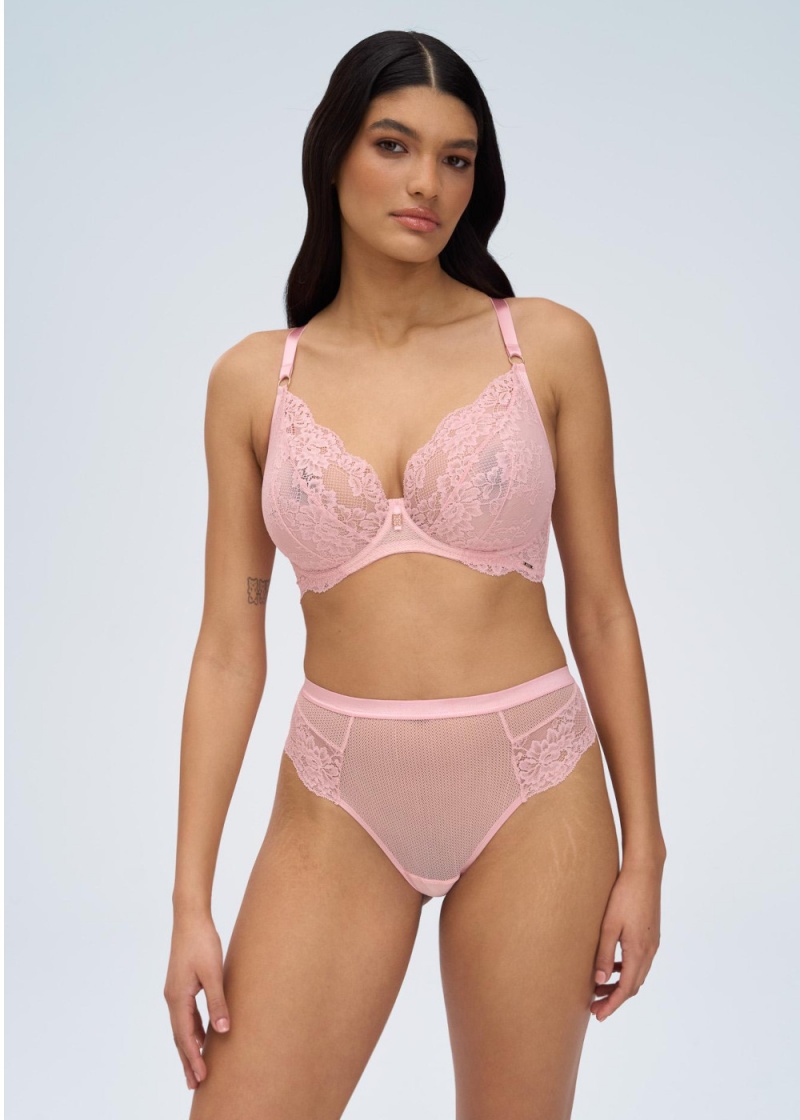Stringi Powder Whisper marki Alles z wysokim stanie w odcieniu pudrowego różu. Stringi to idealne połączenie zmysłowości i komfortu. Tył subtelnie eksponuje pośladki, a koronka doskonale dopasowuje się do sylwetki, gwarantując wygodę przez cały dzień. Wysoki stan podkreśla talię, a wykończenie sprawia, że stringi pozostają niewidoczne pod ubraniem. Model powstał z myślą o kobietach, które cenią lekkość, delikatność i spokojny rytm dnia. Idealnie dopasowują się do sylwetki, otulając ją subtelnie i zapewniając komfort, który pozostaje niemal niewyczuwalny. Model to bielizna w tonacjach blushcore, która łączy nowoczesny krój z romantyczną subtelnością. Pudrowy róż otula ciało miękko i zmysłowo, tworząc elegancką, pastelową alternatywę dla klasycznego nude. Włoska koronka inspirowana stylem retro wprowadza finezję i kobiecość w każdy detal. Tył ze szwem po środku, zakończony bezszwowo koronką. W górnej części trójkątne wycięcie, ozdobione złotym kołeczkiem. W pasie szersza gumka. Całość dopełniają biżuteryjne detale w odcieniu jasnego złota, dodając modelowi luksusowego charakteru. Stringi z wysokim stanem to codzienny luksus – chwile w parku, ciepły uśmiech, ulotne marzenia o miłości – przemienione w pastelową, zmysłową opowieść, w której kobiecość i subtelna siła splatają się z codzienną elegancją. Zmysłowy krój i delikatne przezroczystości nadają im wyjątkowo kobiecego charakteru. Dla lepszego komfortu kroczek podszyty bawełną. Model uszyty w Polsce.