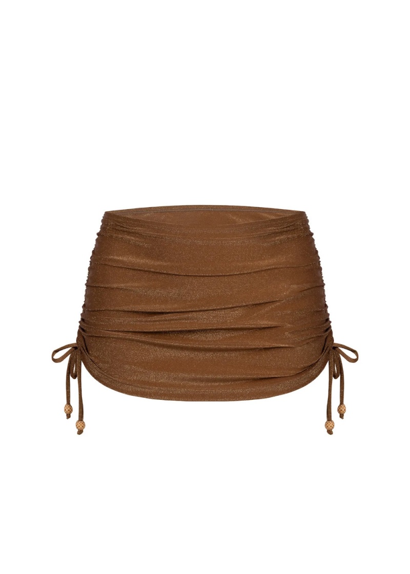 Spódnica plażowa FL80D/874L marki Feba typ mini - regulowana. Spódniczka FL80D/874L została wykonana z miękkiego, elastycznego lurexu o miedziano-rudym kolorze i złotej, delikatnie migoczącej nitce, która pięknie podkreśla opaleniznę i dodaje skórze świetlistego blasku. Materiał jest szybkoschnący, odporny na zagniecenia i bardzo komfortowy w noszeniu, co sprawia, że doskonale sprawdza się zarówno na plaży, jak i podczas spacerów. Po bokach umieszczono sznurki z dekoracyjnymi zakończeniami, które pozwalają precyzyjnie regulować długość spódniczki. Możesz stworzyć krótką, zmysłową wersję z wyraźnym marszczeniem albo bardziej zakrywający fason, idealny na dłuższy spacer. To również świetny wybór dla kobiet, które wolą delikatnie zasłonić pośladki i czuć się bardziej komfortowo na plaży. Marszczenia układają się miękko na sylwetce, optycznie ją wygładzając i tuszując drobne niedoskonałości. Spódniczka wykonana z elastycznej i miękkiej tkaniny.