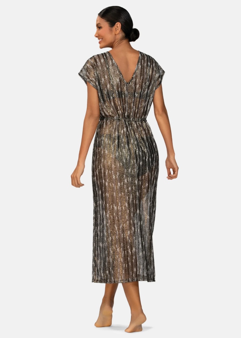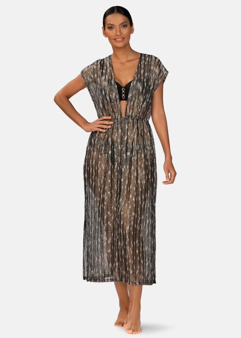 Długa sukienka plażowa F120A/509A/26 marki Feba, wykonana z delikatnej, ażurowej tkaniny. Model został uszyty z miękkiej, przewiewnej tkaniny o lekkim, transparentnym wykończeniu, subtelnie odsłaniając ciało i podkreślając opaleniznę. Połyskująca siateczka z drobną metaliczną nitką (złoto/srebro) daje efekt delikatnych, pionowych pasów, które optycznie wydłużają sylwetkę i nadają stylizacji biżuteryjnego blasku. Fason z krótkim rękawem typu kimono oraz dekoltem w serek delikatnie eksponuje ramiona, zapewniając jednocześnie pełną swobodę ruchów - idealnie sprawdzi się zarówno na plaży, jak i podczas letniego spaceru po promenadzie. Przód narzutki jest otwarty i regulowany sznurkiem w talii, co pozwala dowolnie dopasować fason do sylwetki oraz podkreślić kobiece kształty. Dodatkowe rozcięcia po bokach zwiększają komfort noszenia i nadają stylizacji lekkości, a długość maxi doskonale maskuje drobne niedoskonałości figury. Produkt uszyty w Polsce, to gwarancja jakości i dbałości o detal.